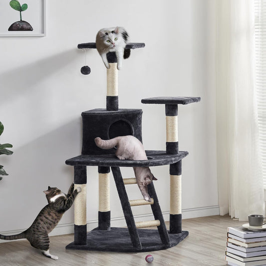 54In Cat Tree, Multi-Level Cat Tower with Spacious Kitten-Ear Perch, 2 Cozy Caves, Scratching Posts, Climbing Ladder, 2 Plush Balls, Durable Pet House Furniture for Indoor Kittens, Dark Gray
